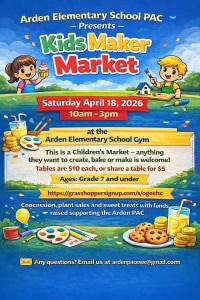 Arden Elementary Kids Maker Market: Arden is hosting a Kids Maker Market Saturday April 18 from 10am to 3pm. There are still a few tables available for more details please go to : www.grasshoppersignup.com/s/ogeehc Tables sales go to support the Arden PAC.