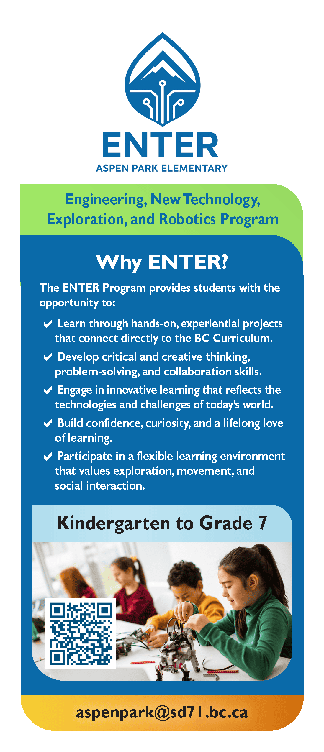 Beginning in the 2026–27 school year, the ENTER Program will serve Kindergarten to Grade 7, offering students a hands-on, inquiry-based learning model that integrates engineering, technology, robotics and design with the BC curriculum. The program emphasizes creativity, critical thinking, problem-solving and collaboration, while fostering curiosity and confidence in learners.