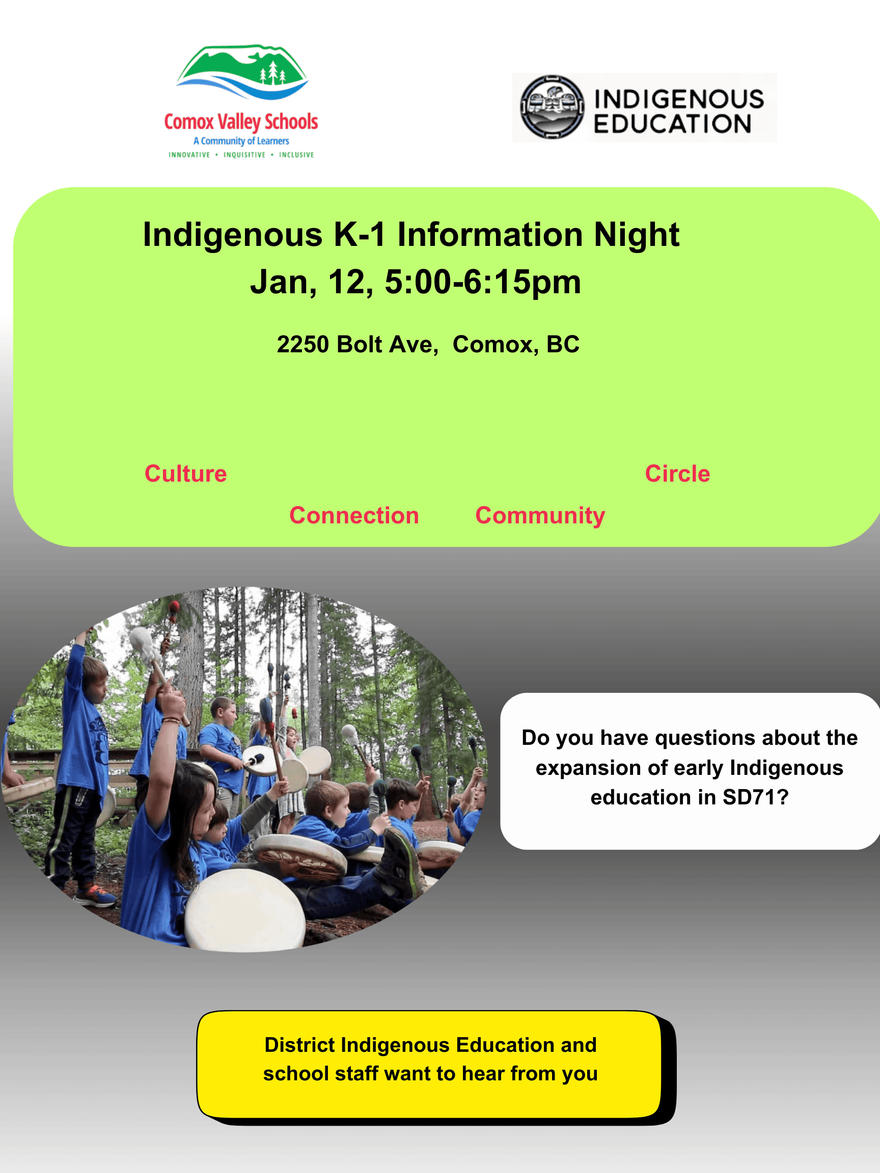 Families are invited to learn more about the new expanded Indigenous K/1 program offered through Comox Valley Schools at Aspen Park Elementary.