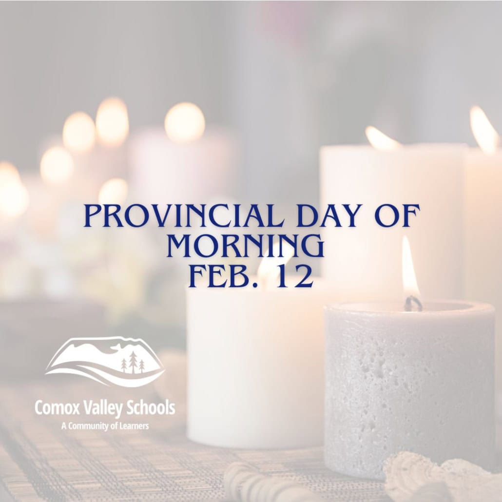 On this Provincial Day of Mourning and every day, Comox Valley Schools is unwavering in our dedication to our values of empathy, kindness, acceptance, safety, and inclusion. We encourage all members of our school community to support one another with compassion and care, recognizing that events such as these can affect people in different ways. Our schools remain places of belonging where every student and staff member is valued, respected, and supported.