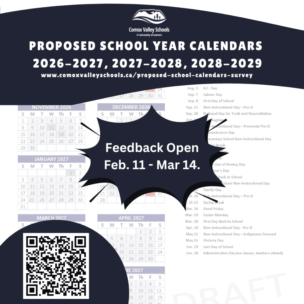 The calendars must meet instructional hours set by the Ministry of Education and Child Care. The draft calendars were developed the calendar committee which includes representatives from Senior Leadership, the Comox Valley Principals and Vice-Principals Association (CVPVPA), the Comox District Teachers’ Association (CDTA), CUPE, the District Parent Advisory Council (DPAC), and a Trustee representative.