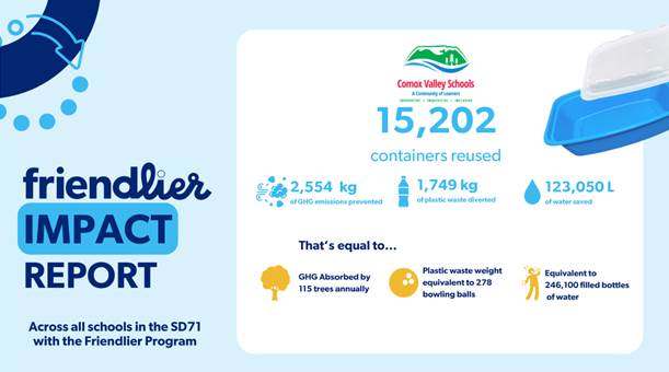 The district has also partnered with Friendlier, a reusable dish service, in several schools to reduce waste and support environmentally responsible meal delivery with over 15,000 containers being reused over three months this fall.