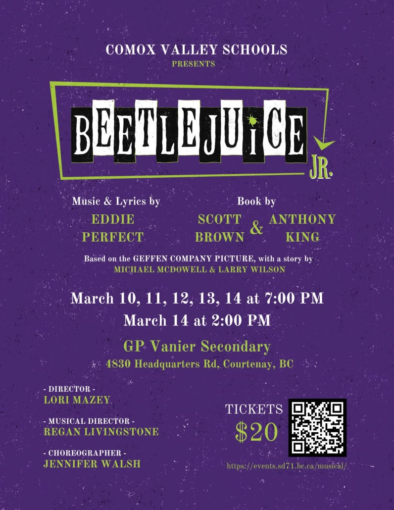 What follows is a hilarious and heartfelt adventure filled with catchy songs, bold characters, and plenty of spooky surprises. Bursting with humor, creativity, and great student performances, Beetlejuice Jr. is a family-friendly production that celebrates individuality and the joy of being yourself.